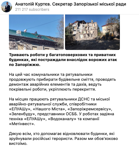 В Запорожье продолжаются работы в многоэтажных и частных домах в центре города, пострадавших в результате обстрелов 6 октября. Тогда, напомним, погибли 20 человек.
