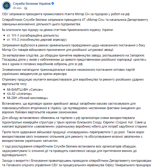 Задержание произошло в рамках дела по незаконной поставке со стороны "Мотор Сичи" товаров военного назначения для российской штурмовой авиации. По материалам следствия, к сделке причастно руководство завода, расположенного в Запорожье. Чиновники действовали в сговоре с приближенными к Кремлю представителями российской корпорации "Ростех", которая является одним из главных производителей вооружений для России.