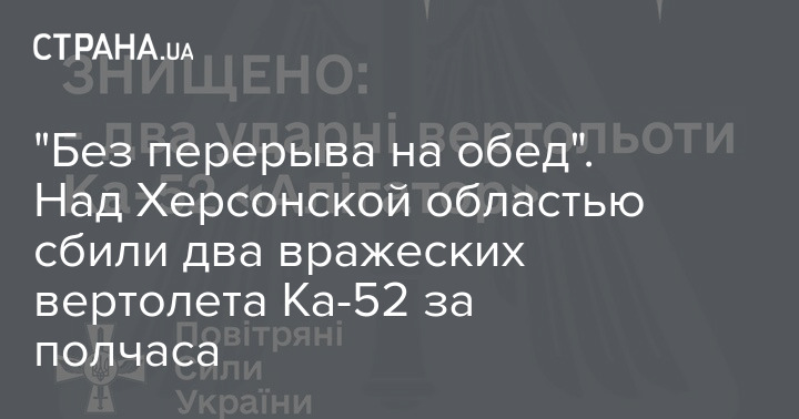 В течении получаса в Херсонской области сбиты два российских ударных вертолета Ка-52. 24 октября, с 13.00 по 13.30, в Бериславском районе Херсонщины, подразделениями Одесской и Херсонской зенитных ракетных бригад Воздушное командование "Юг" Воздушных Сил сбито два ударных вертолета Ка-52" - написали в Командовании.