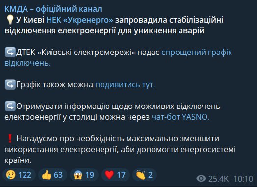 "Киевские электросети" публикуют график отключений по группам потребителей: