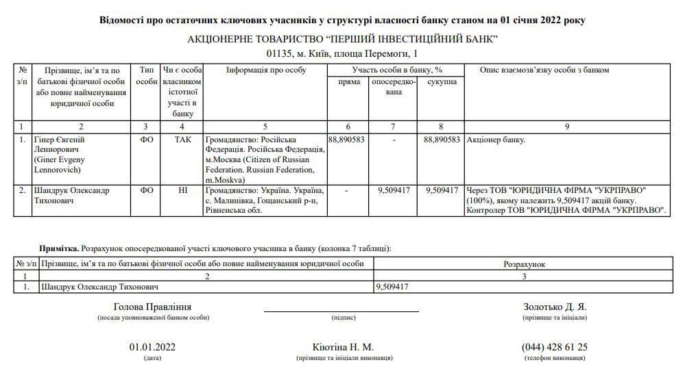 По информации Нацбанка, 88,89% акций Первого инвестбанка принадлежит российскому гражданину Евгению Гинеру, против которого на прошлой неделе были введены санкции СНБО.