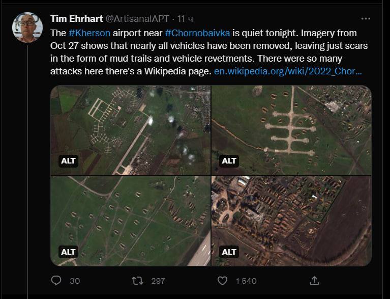 "В херсонском аэропорту около Чернобаевки сегодня тихо. На снимках от 27 октября видно, что почти все транспортные средства убрали, остались только грязевые следы и обшивки транспортных средств", - пишет Эрхарт в своем твиттере.