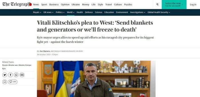 12.08 "Пришлите нам одеяла и генераторы, или мы замерзнем до смерти", - такую цитату мэра Киева Виталия Кличко, обращенную к Западу, выносит в заголовок своего материала The Telegraph.