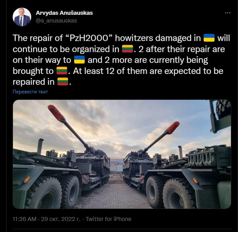 12.52 Литва отремонтирует для Украины 12 гаубиц, поврежденных на войне. Об этом заявляет в твиттере министр обороны прибалтийской страны Арвидас Анушаускас.