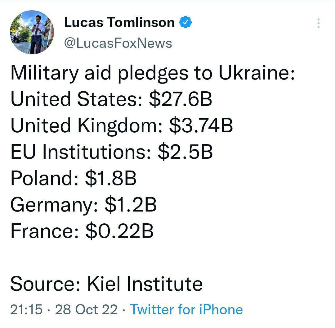 13.33 Америка остается безусловным лидером по военной помощи Украине. Такие данные приводит корреспондент Fox News Лукас Томлинсон у себя в твиттере со ссылкой на Кильский институт.