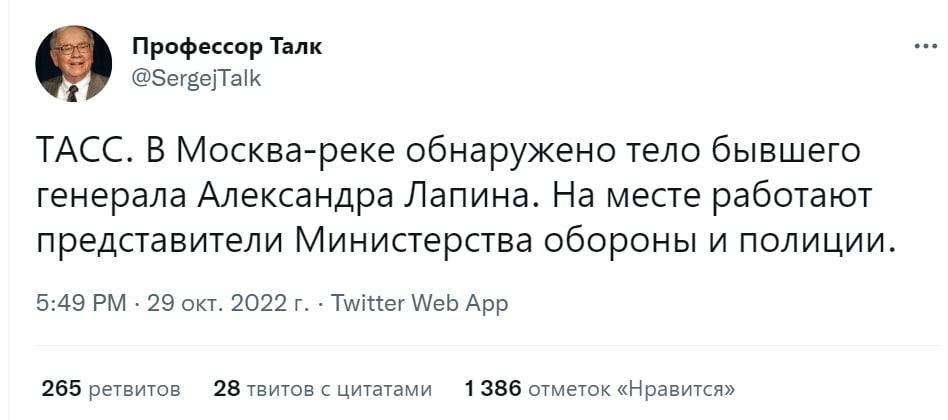 21.54 По украинским СМИ сегодня вечером прошла новость, что в Москве выловили из реки тело российского генерала Александра Лапина - того, который командовал луганской группировкой противника и был сегодня, судя по всему, отстранен от должности.