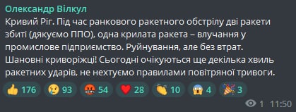 "Последствия могли быть гораздо хуже. Но благодаря героической и профессиональной работе ПВО из более чем 50 выпущенных по нашей территории ракет сбито 44. Спасибо бойцам, защищающим наше небо", - написал он.
