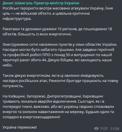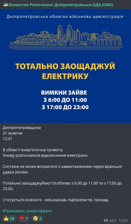 Тем временем глава Днепропетровской ОВА Валентин Резниченко заявил, что энергосистема Днепропетровской области не может выдержать нагрузки из-за утренних ударов. Местные власти призывают экономить электроэнергию в пиковые часы.