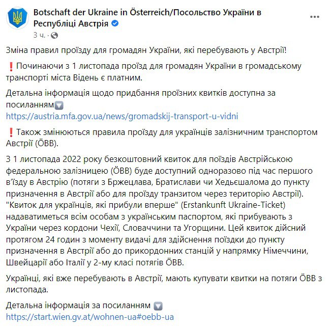 "С 1 ноября 2022 года бесплатный билет для поездов Австрийской федеральной железной дорогой (ÖBB) будет доступен однократно во время первого въезда в Австрию.