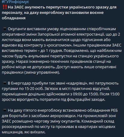 По данным разведчиков Украины, оккупанты выставили условие лицензированным сотрудникам оперативной смены ЗАЭС, что до 2 ноября они должны определиться относительно того, будут ли они подписывать контракт с "Росатомом" или же отказываются сотрудничать с ним.