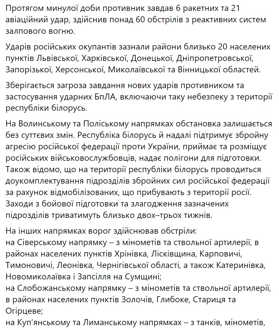 3. За прошедшие сутки противник нанес 6 ракетных и 21 авиационный удар, совершил более 60 обстрелов из реактивных систем залпового огня.