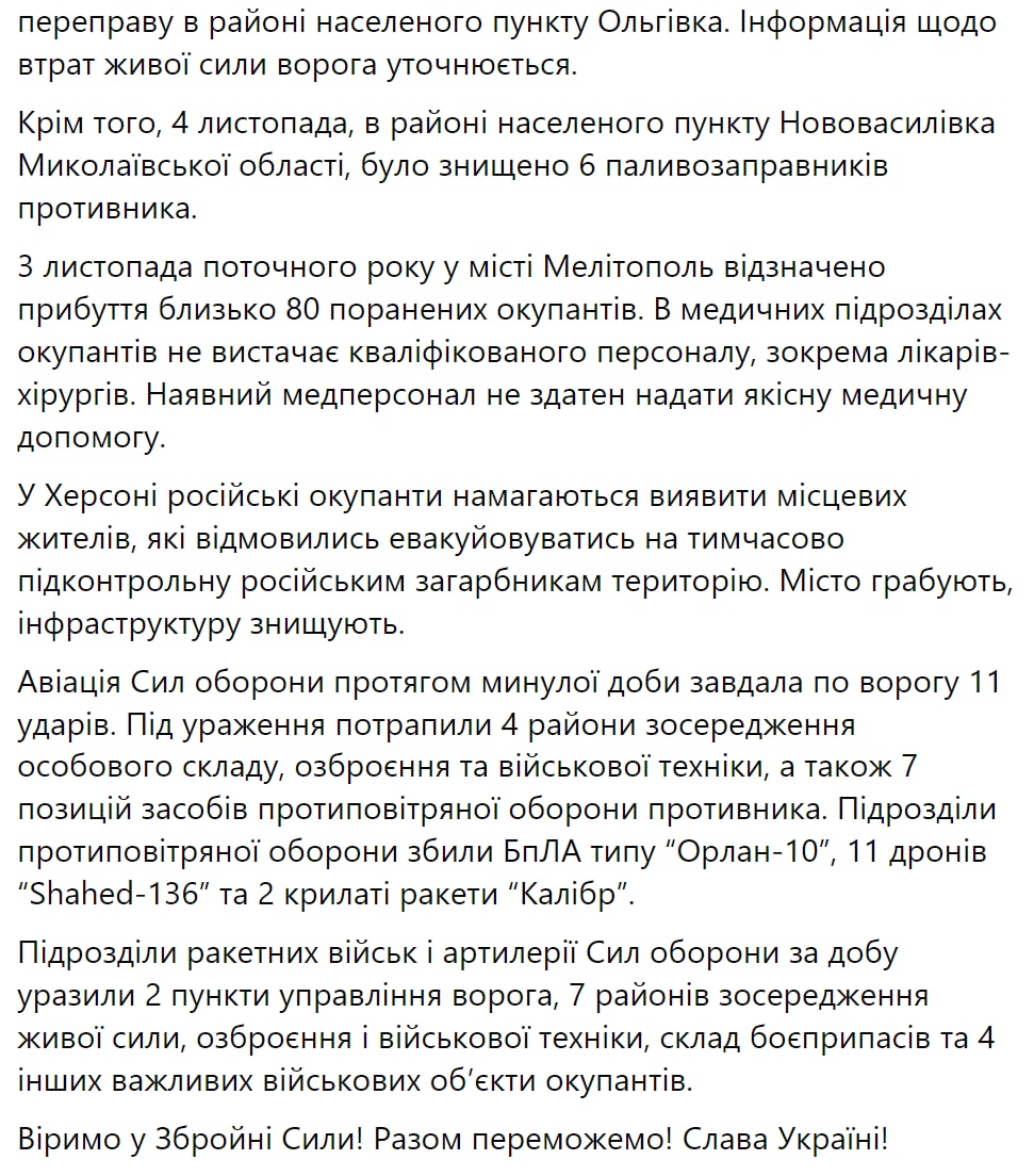 5. Генштаб уточняет, что за сутки в Украине сбили БПЛА "Орлан-10", 11 дронов "Shahed-136" и две крылатые ракеты "Калибр".