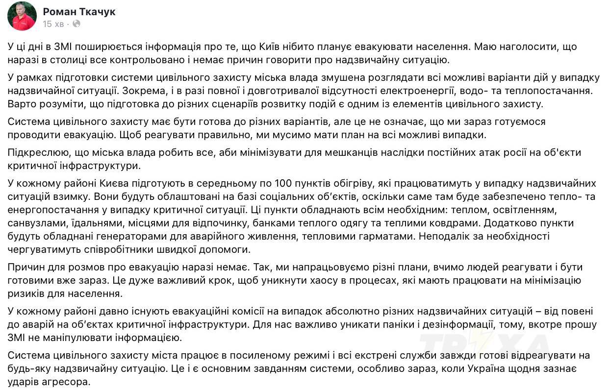 "Если не будет электричества, не будет воды и канализации. В настоящее время правительство и городская администрация принимают все возможные меры для защиты нашей системы электроснабжения", - добавил Ткачук.