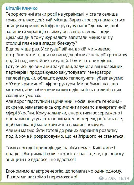 "Несколько дней назад журналисты спросили меня: есть ли у столицы план на случай блекаута? Отвечу еще раз. В ситуации войны, в которой мы живем, нужно иметь планы на случай разных сценариев развития событий и чрезвычайных ситуаций. И быть готовым действовать... Но враг коварен и циничен. Россия совершает геноцид - в частности, пытаясь вызвать коллапс в энергетической сфере Украины. Коммунальщики, энергетики сосредоточенно и оперативно устраняют повреждения сетей, делают все, чтобы у жителей были критически важные услуги. Но мы должны быть готовы к разным вариантам развития событий, хотя и рассчитываем, что худшего не произойдет. Поэтому сегодня поводов для паники нет. Киев живет и работает", - написал мэр.