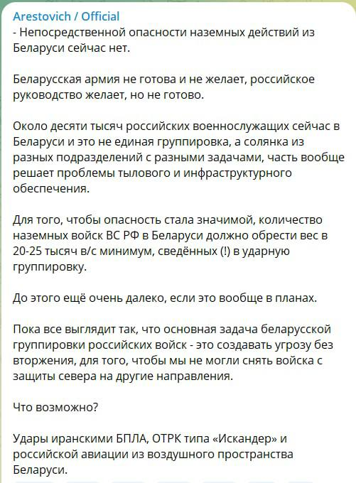 По мнению Арестовича, непосредственной опасности наземных действий из Беларуси сейчас нет.