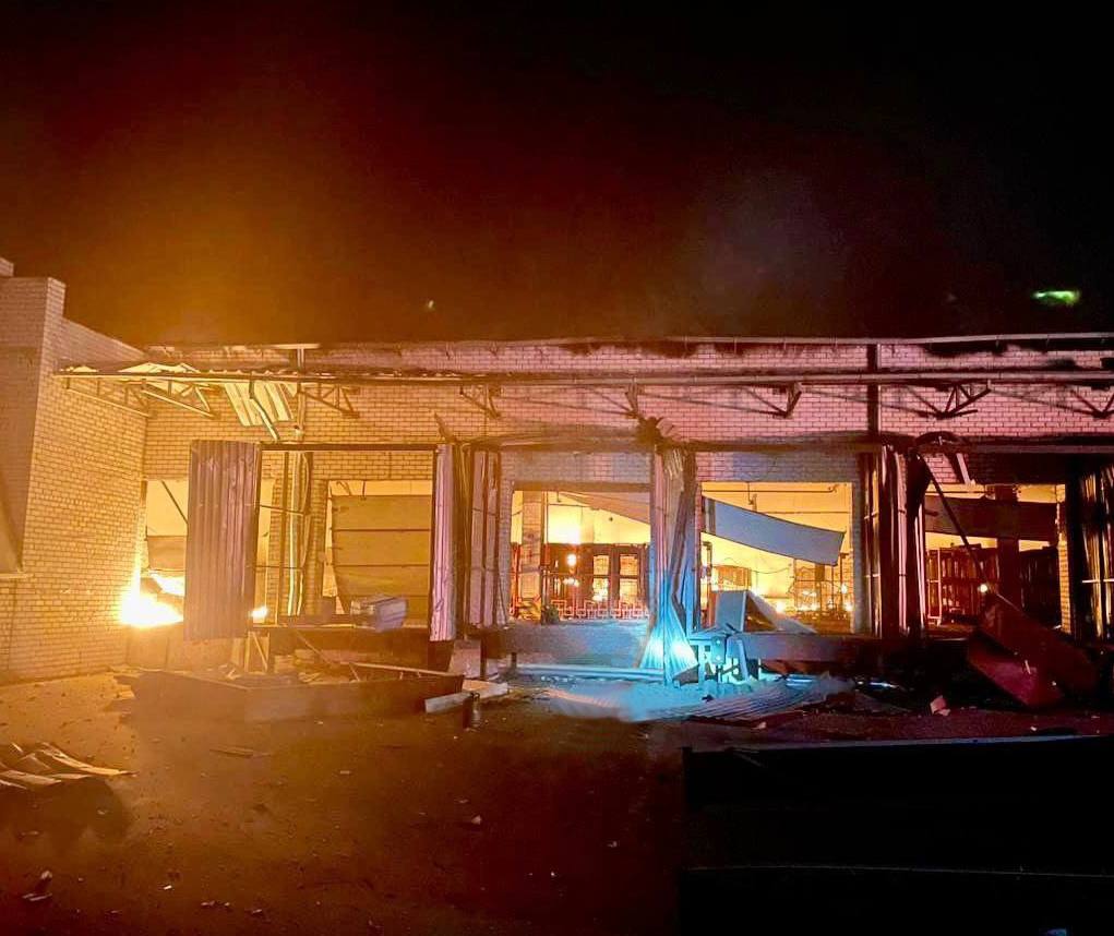 В результате попадания дрона вспыхнул мощный пожар, площадь горения составила более 3 тысяч квадратных метров. К утру спасателям удалось утихомирить пламя. Разрушены склады предприятия.