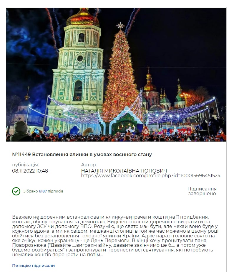 08:45 В Киеве набрала нужное количество голосов (6000) петиция об отказе от новогодней елки.