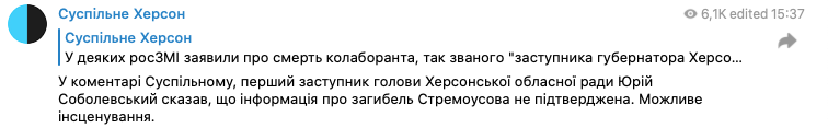 Первый заместитель председателя Херсонского областного совета Юрий Соболевский заявил, что информация о гибели Кирилла Стремоусова пока не подтверждена.