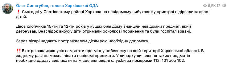 В Салтовском районе Харькова двое детей подорвались на неизвестном взрывном устройстве, которое нашли в кустах возле дома. В результате двое мальчиков 15 и 12 лет получили осколочные ранения и были госпитализированы.