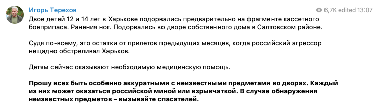 Мэр города Игорь Терехов уточняет, что второму ребенку было 14, а не 15 лет, и подорвались они, предварительно, на фрагменте кассетного боеприпаса, который нашли во дворе собственного дома.