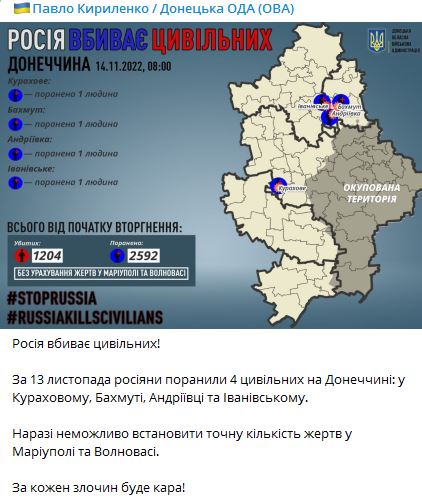 08.10 За прошедшие сутки в Донецкой области от обстрелов РФ ранены 4 мирных жителя - в Бахмуте, Курахово, Андреевке и Ивановском.