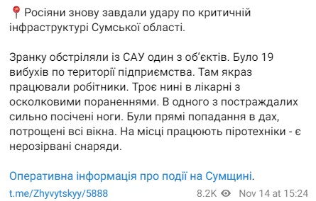 Россияне обстреляли Сумскую область. Фото: t.me/Zhyvytskyy