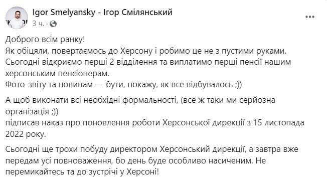 "Сегодня откроем первые 2 отделения и выплатим первые пенсии нашим херсонским пенсионерам... А чтобы выполнить все необходимые формальности (все же мы серьезная организация) подписал приказ о возобновлении работы Херсонской дирекции с 15 ноября 2022 года", - написал он.