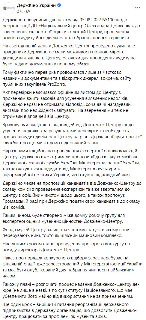 Государственное агентство по вопросам кино приостанавливает действие приказа о реорганизации Довженко-Центра до завершения экспертной оценки коллекций Центра, проведения полного аудита его деятельности и избрания нового руководителя.