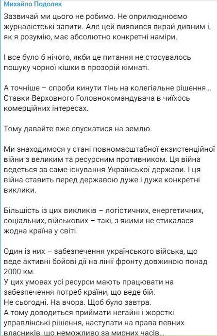 На запрос публично ответил советник Ермака Михаил Подоляк. В своем тг-канале он назвал его попыткой "бросить тень на коллегиальное решение Ставки верховного главнокомандующего в коммерческих интересах".
