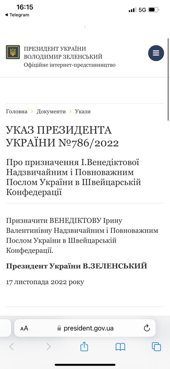 Напомним, информацию о назначении Венедиктовой послом в Швейцарии подтверждал в августе народный депутат Ярослав Железняк у себя в Телеграм. Он писал, что представление МИДа на тот момент уже было.