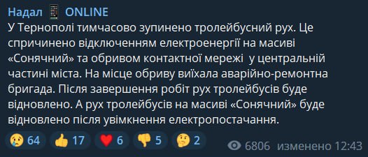 «Мы в Тернополе помним похожие отключения конца 90-х. Но сейчас война. И гораздо хуже ситуация в городах центральной, восточной, южной и северной Украины: Киеве, Днепре, Запорожье, Харькове. Так сейчас начинает жить и наш город», – добавил он.