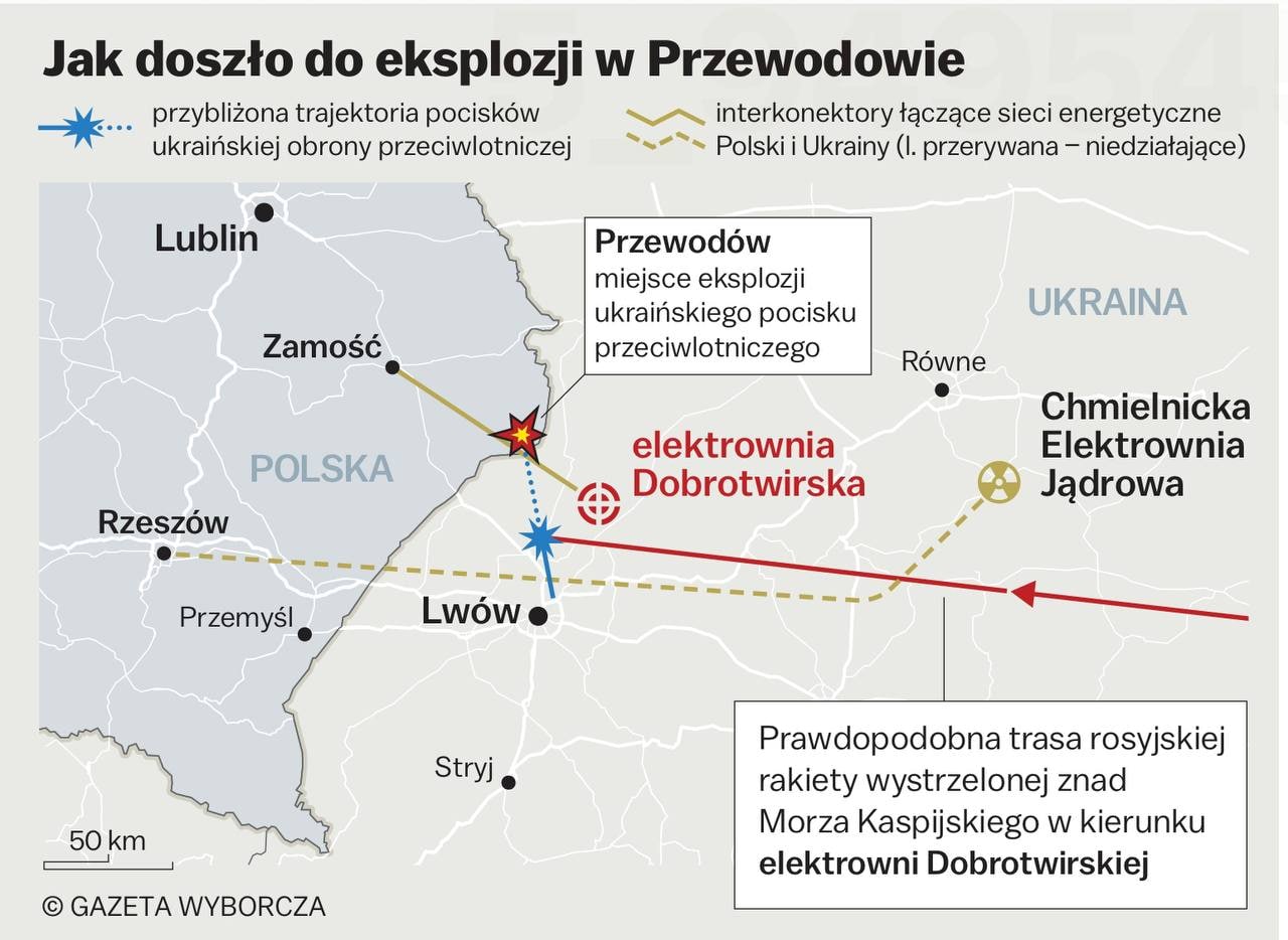 При этом, судя по карте, которую рисует польское издание, украинская ракета летит не в сторону ТЭЦ (на северо-восток), а в направлении Польши, то есть западнее.
