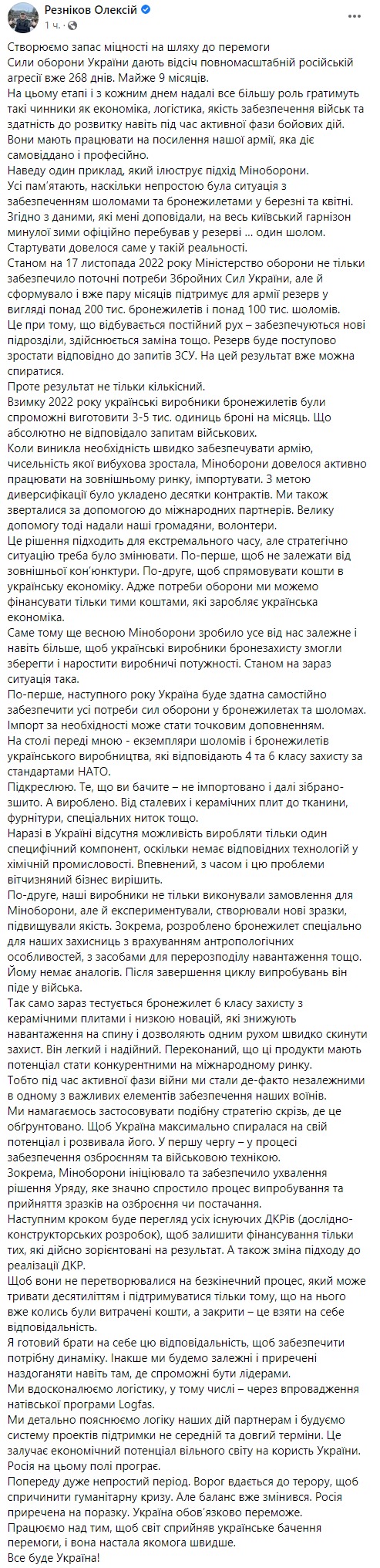"Во-первых, в следующем году Украина будет способна самостоятельно обеспечить все потребности Сил обороны в бронежилетах и шлемах. Импорт при необходимости может стать точечным дополнением", - написал Резников.