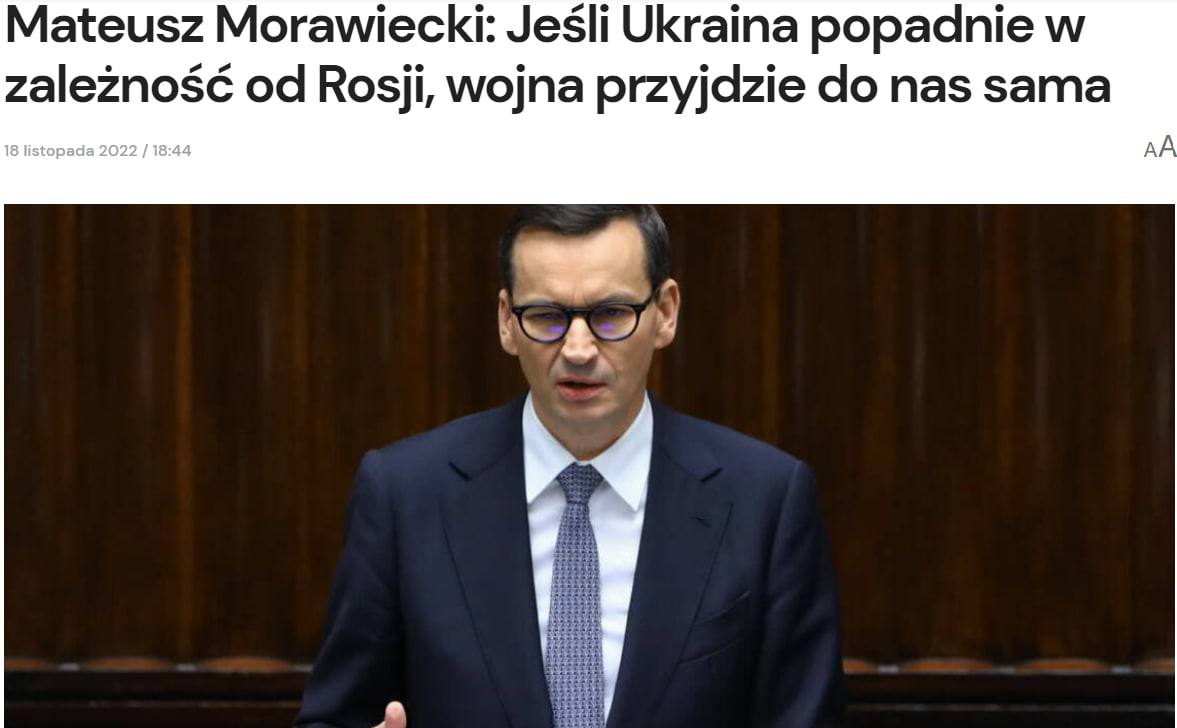 «Сегодня есть только один способ втянуть Польшу в войну – отвернуться от Украины. Если Польша ее не поддержит, она попадет в огромную зависимость от России, и тогда война придет к нам сама собой», — заявил Моравецкий в своем еженедельном подкасте.