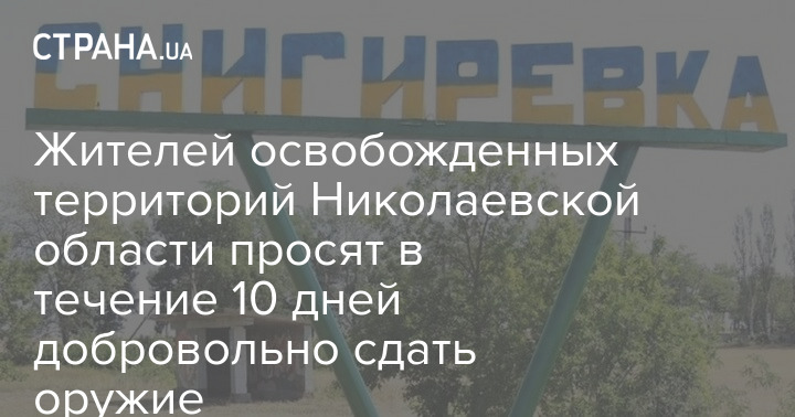 Жителей освобождённых территорий Николаевской области, в частности Снигиревской территориальной громады и Снигиревки, просят в 10-дневный срок сдать оружие и боеприпасы. Иначе - уголовное дело.