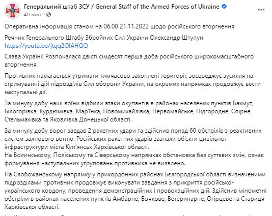 В понедельник, 21 ноября, Генштаб Вооруженных Сил Украины обнародовал сводку о ситуации на фронте по состоянию на утро.