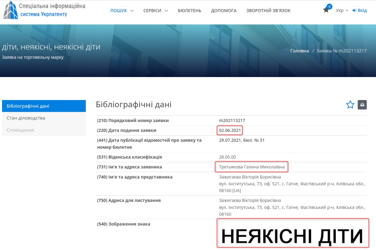 По данным "Укрпатента", примерно через год после скандала, человек по имени Галина Третьякова подала на регистрацию товарный знак "Некачественные дети". Пока что знак не зарегистрирован и проходит экспертизу.