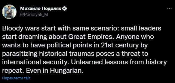 "Любой, кто хочет иметь политические очки в 21 веке, паразитируя на исторических травмах, представляет угрозу международной безопасности. Невыученные уроки истории повторяются. Даже на венгерском", - написал он.