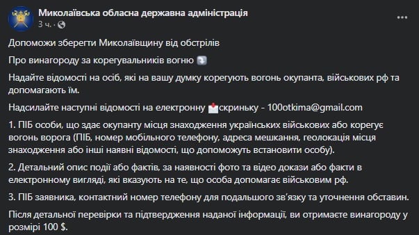 11.25 В Николаевской области предлагают вознаграждение 100 долларов за информацию о корректировщиках огня.