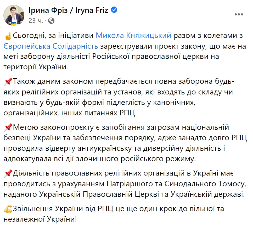 По словам нардепа Ирины Фриз, в законопроекте говорится, что "деятельность православных религиозных организаций в Украине должна проводиться с учетом Томоса".