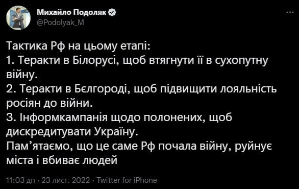 Он также сообщил, что РФ планирует теракты в Белгороде для повышения лояльности среди россиян, а также информкампанию с пленными для дискредитации Украины.