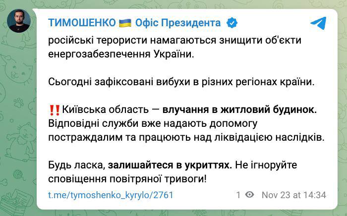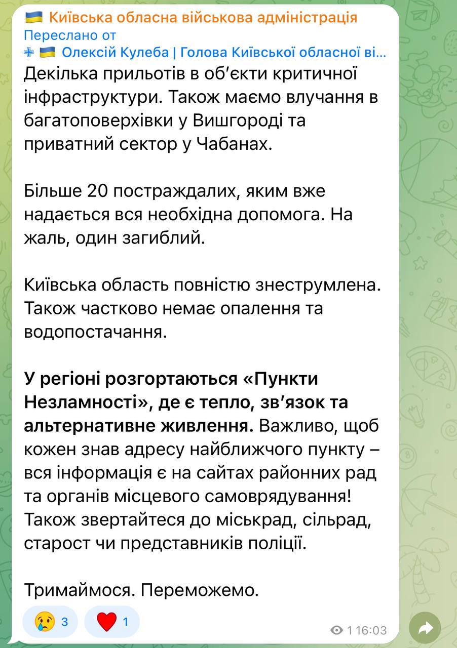 Ранее в Офисе президента заявили, что свет начнут восстанавливать с завтрашнего утра.