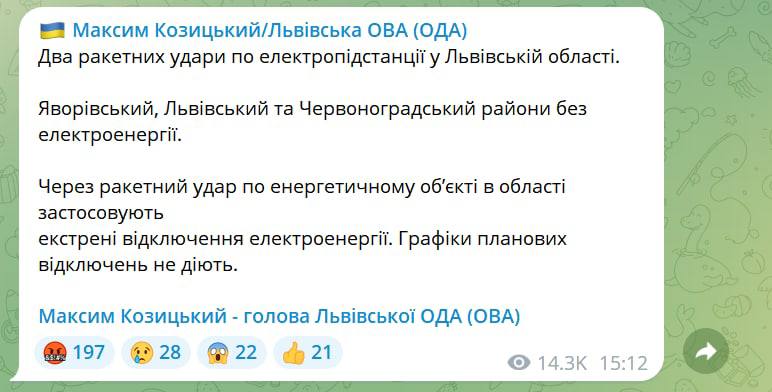 Также в своем телеграм-канале Тимошенко сообщил, что 90% электроснабжения во Львовской области уже восстановлено.
