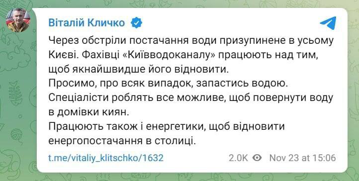 Полное восстановление водоснабжения в Киеве ожидается, по словам Сахарука, "в ближайшее время".