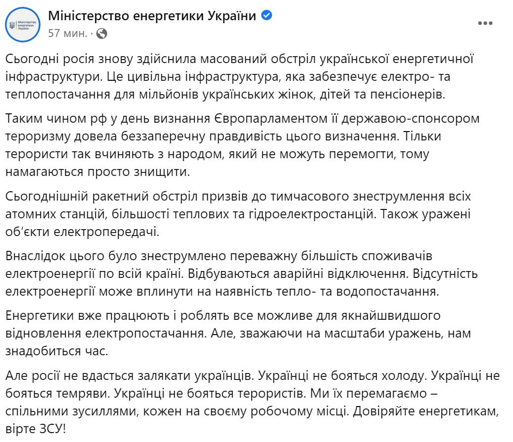 21:12 Украинская энергосистема заработает в ближайшие 24 часа.