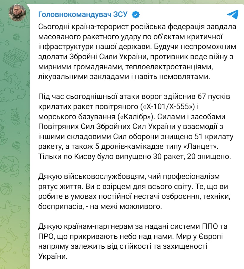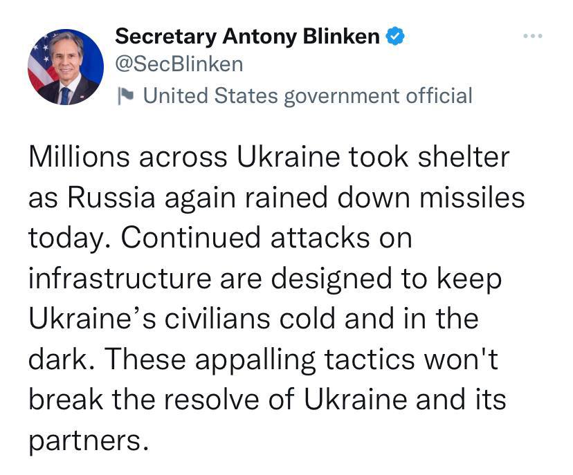 «Продолжающиеся атаки на инфраструктуру призваны держать гражданское население Украины в холоде и темноте. Эта ужасающая тактика не сломит решимости Украины и ее партнеров», – заявил Энтони Блинкен.
