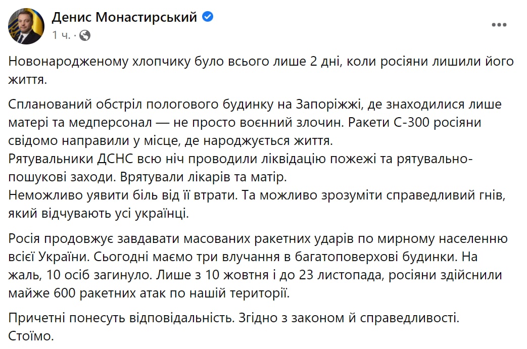 06.00 Ночью в Вольнянске Запорожской области РФ обстреляла родильное отделение больницы. Погиб новорожденный ребенок.