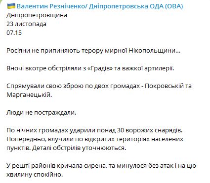Били по двум громадам - Покровской и Марганецкой. По ним было выпущено более 30 вражеских снарядов. Предварительно попали по открытым территориям населенных пунктов. Детали обстрелов уточняются. К счастью, люди не пострадали.