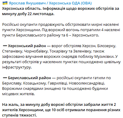 По информации Янушевича, российские войска обстреляли 10 населенных пунктов Херсонской области 22 ноября. В общей сложности под обстрелы попали шесть населенных пунктов Херсонского района, в том числе областной центр и населенные пункты в Бериславском районе.