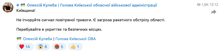 Власти Киевской области также предупреждают об угрозе ракетного удара.